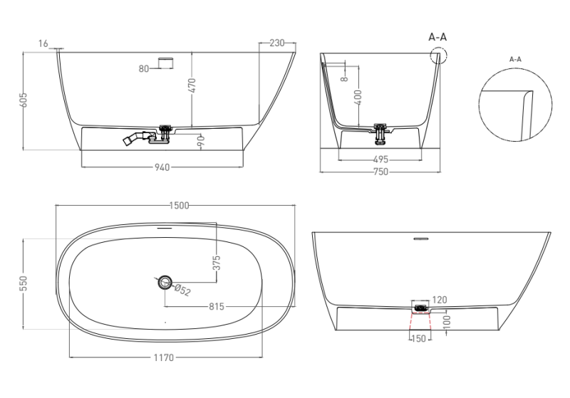 Ванна из искусственного камня Salini Sofia S-Stone 102528MRH 150x75см RAL снаружи