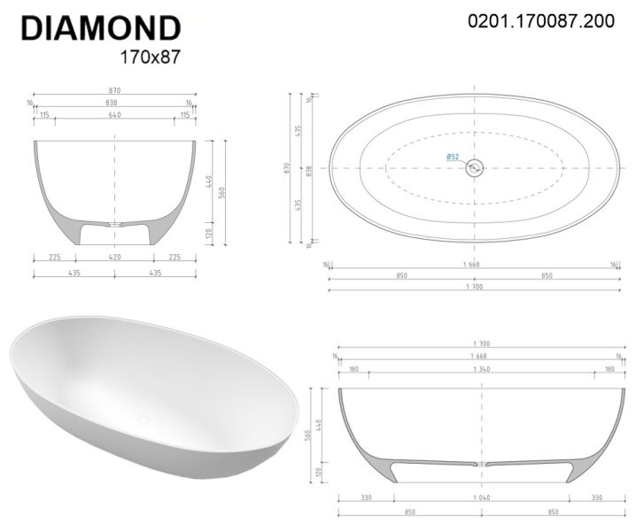 Ванна из искусственного камня Whitecross Diamond 0201.170087.200 170x87см белый матовый