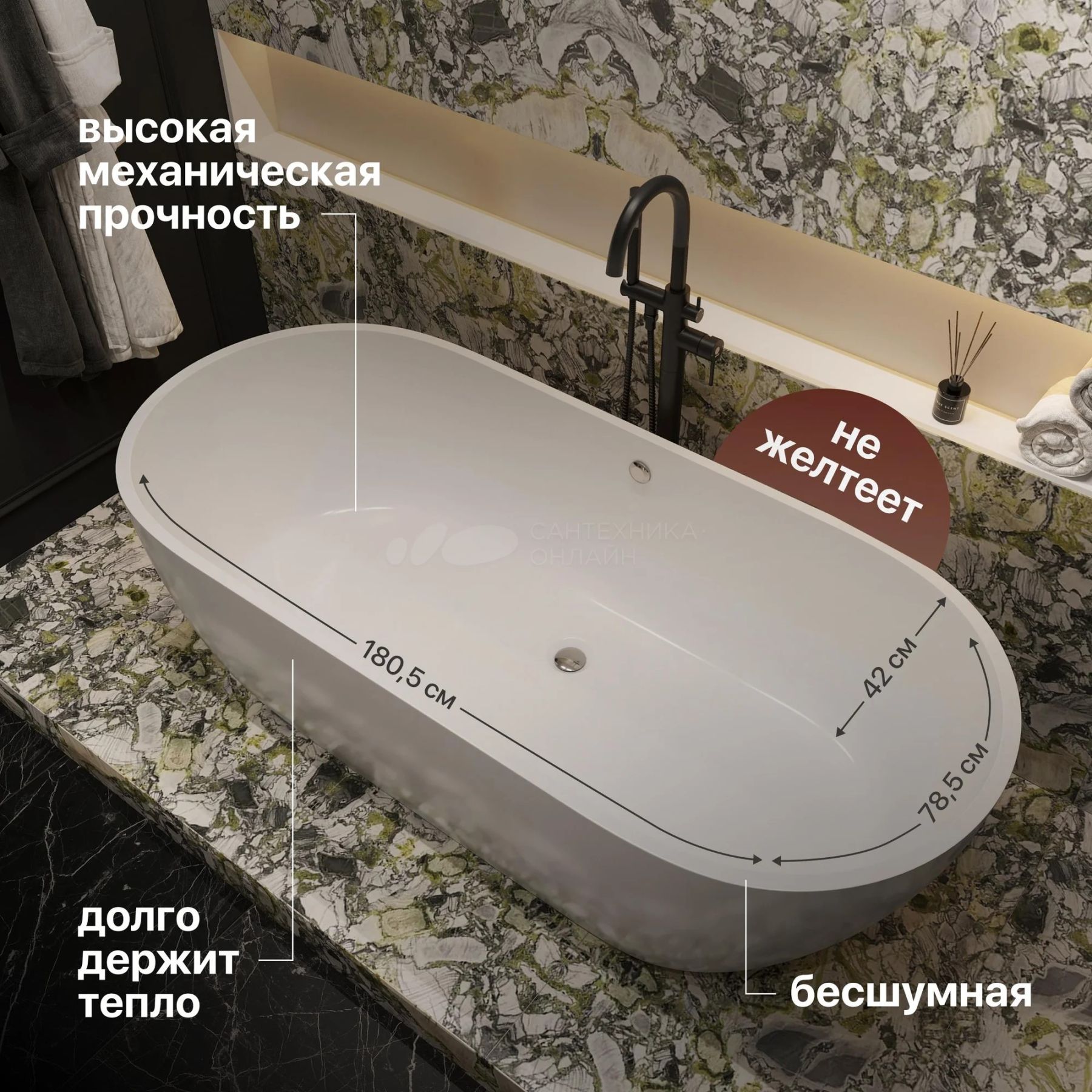 • Стенки ванны хорошо поглощают звук, что делает набор воды практически бесшумным