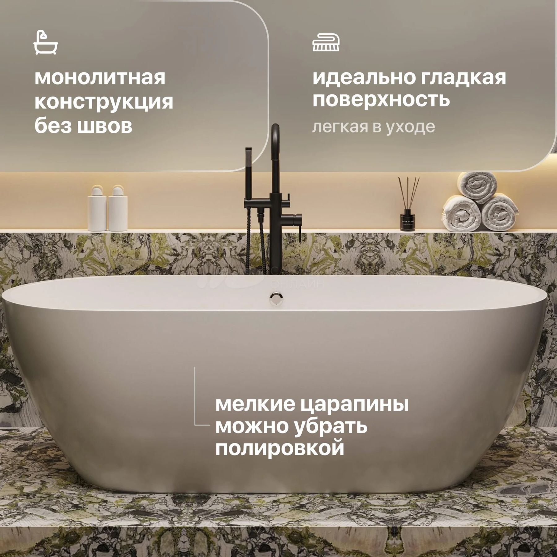 • Монолитная конструкция не имеет швов, что делает ванну более надежной и долговечной