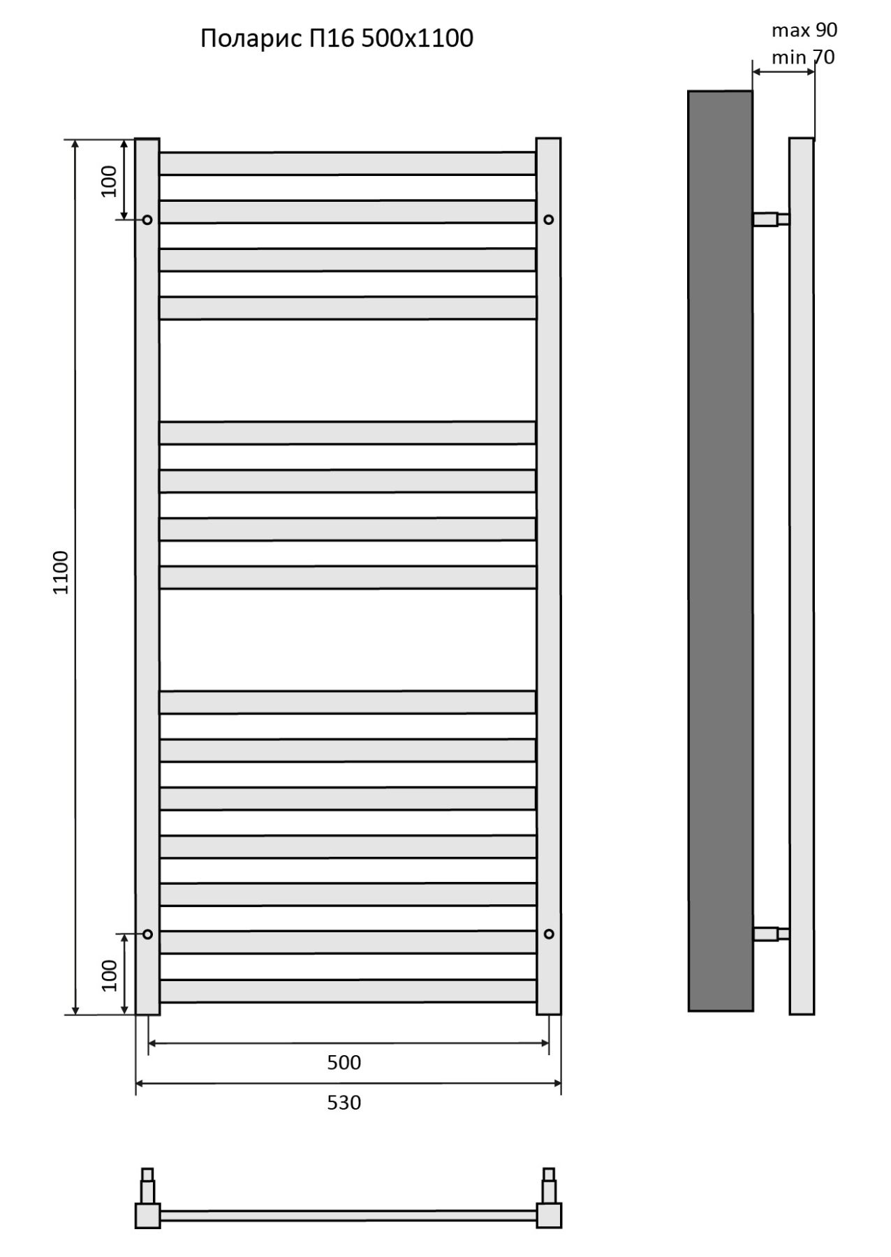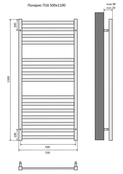 Полотенцесушитель водяной Aquatek (Акватек) П16 500х1100 мм, подключение нижнее/диагональное, сверхпрочная пищевая нержавеющая сталь AISI 304L, гарантия 10 летХарактеристики: Стойка квадрат 30х30, ребра овал 29, без фитинговКомплектация:полотенцесушитель;