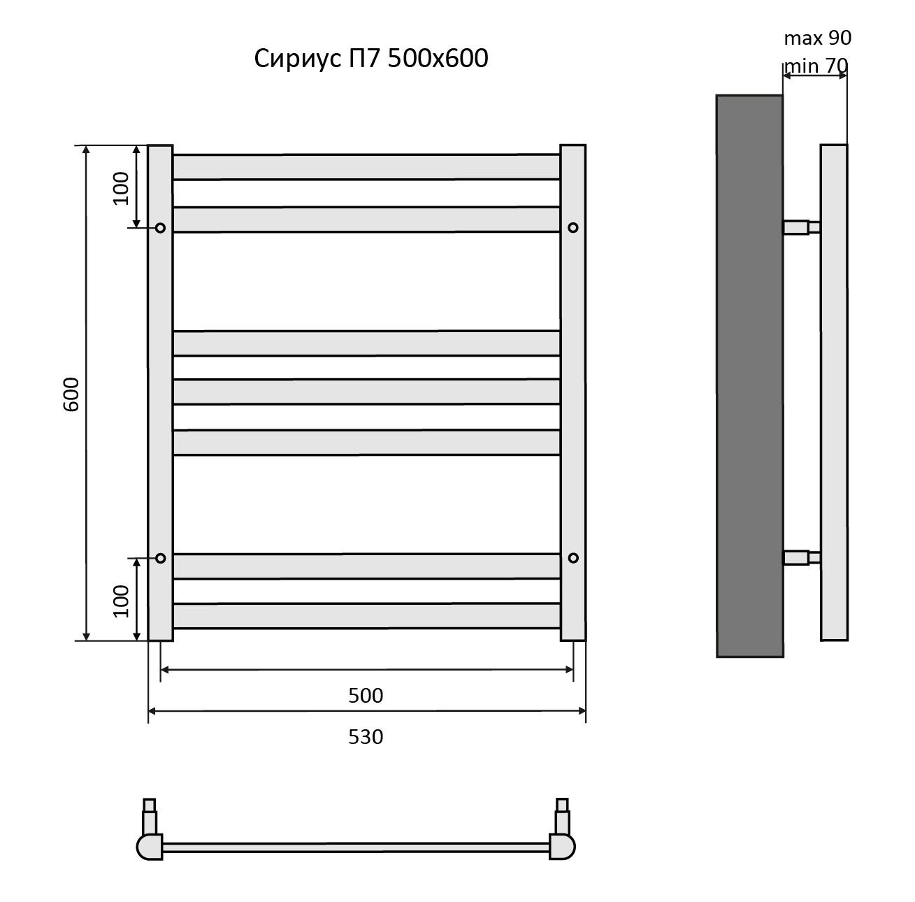 Полотенцесушитель водяной Aquatek (Акватек) Сириус П7 500х600 мм, подключение нижнее/диагональное, сверхпрочная пищевая нержавеющая сталь AISI 304L, гарантия 10 летХарактеристики:Dх30х10,без фитинговКомплектация:полотенцесушитель;