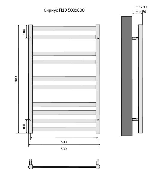 Полотенцесушитель водяной Aquatek (Акватек) Сириус П10 500х800 мм, подключение нижнее/диагональное, сверхпрочная пищевая нержавеющая сталь AISI 304L, гарантия 10 летХарактеристики:Dх30х10,без фитинговКомплектация:полотенцесушитель;