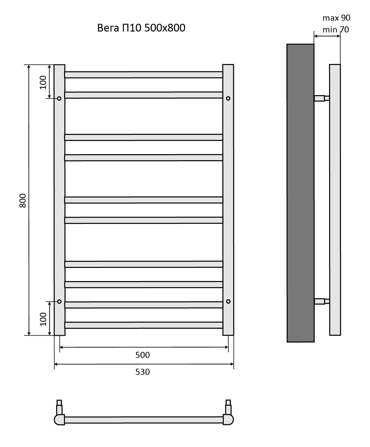 Полотенцесушитель водяной Aquatek (Акватек) Вега П10 500х800 мм, подключение нижнее/диагональное, сверхпрочная пищевая нержавеющая сталь AISI 304L, гарантия 10 летХарактеристики:Стойка D-обр., ребра Ф 18, без фитинговКомплектация:полотенцесушитель;