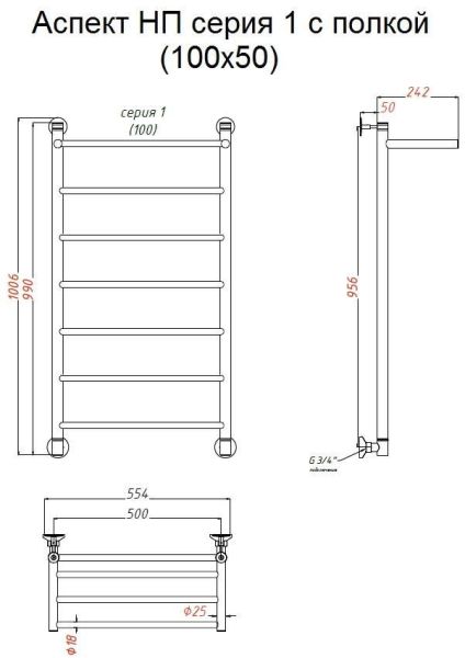 Водяной полотенцесушитель Тругор Аспект НП 1 П с полкой 100x50см хром Аспект1/нп10050П