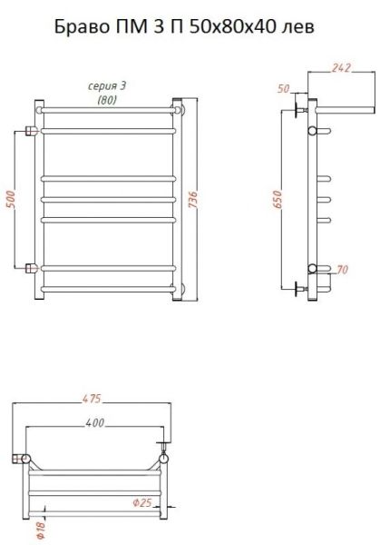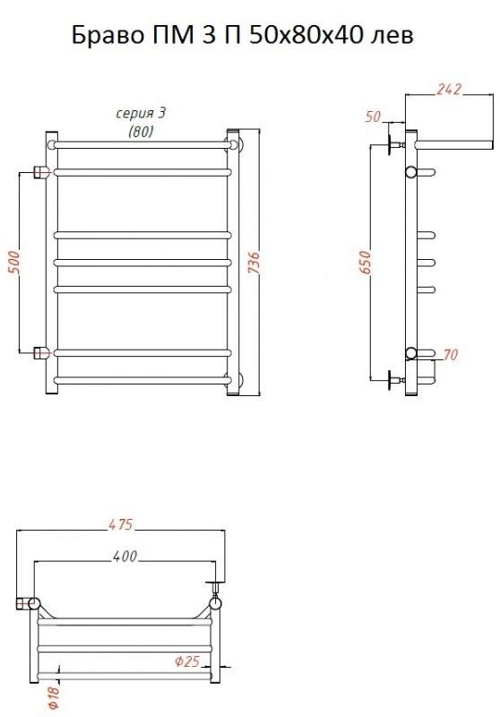 Водяной полотенцесушитель Тругор Браво ПМ 3 П 50x80x40см с полкой левый хром Браво3/ПМ508040Плев