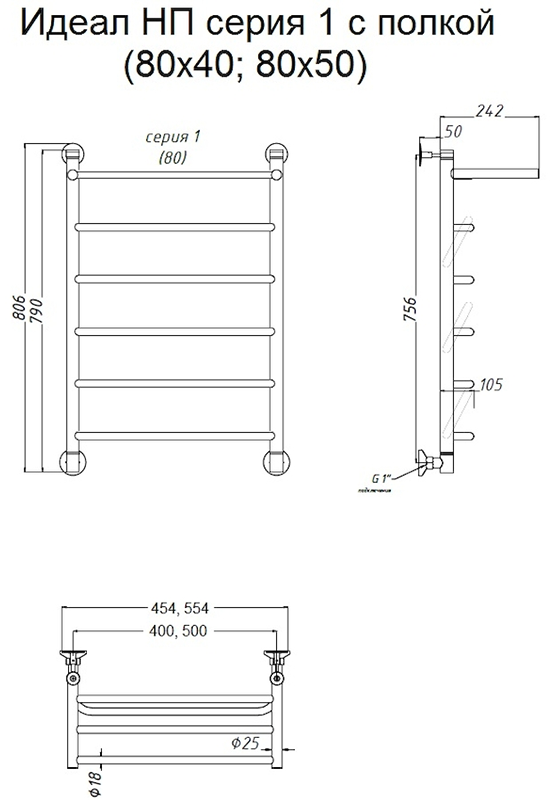 Водяной полотенцесушитель Тругор Идеал НП 1 П с полкой 80x40см хром Идеал1/нп8040П