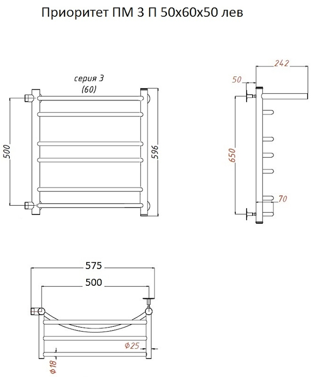 Водяной полотенцесушитель Тругор Приоритет ПМ 3 П 50x60x50см с полкой левый хром Приоритет3/ПМ506050Плев