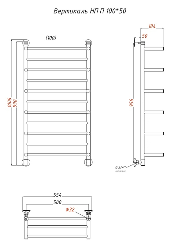 Водяной полотенцесушитель Тругор Вертикаль НП П с полкой 100x50см хром Вертикаль/нп10050П