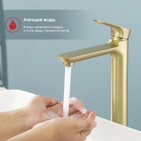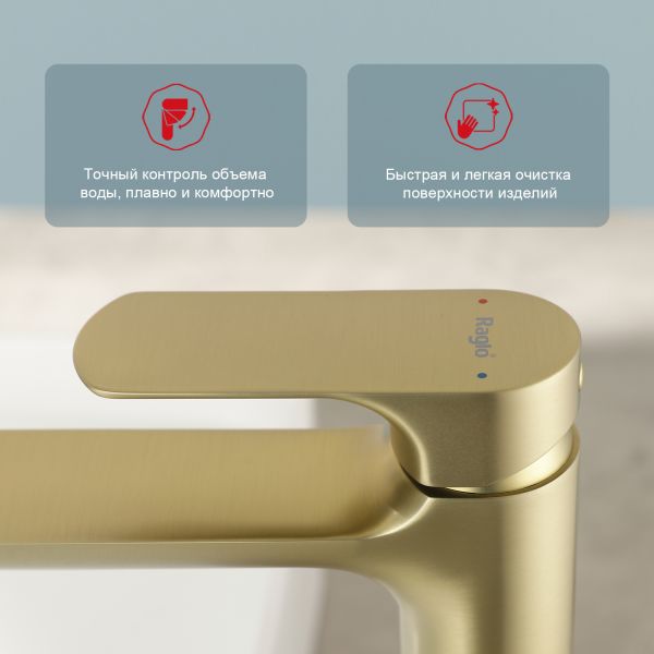 Смеситель для раковины Raglo R03.15.03, сатин золотой. Смеситель для раковины RAGLО имеет повышенную прочность корпуса. Соответствует требованиям международного стандарта. Одна рукоять для регулировки воды. Аэратор гарантирует одинаковый поток воды, сеточка рассеивает напор, вода смягчается. Смеситель устанавливается на гайке, нижняя часть смесителя вставляется в отверстие для монтажа и затягивается гайкой для фиксации. Данный смеситель для умывальника имеет надежный стационарный излив, не меняющий своего положении. Смеситель прекрасно смешивает потоки воды, а помимо этого обладает невысоки показателем шумов. Быстрый монтаж. Гарантия производителя 7 лет. Отлично подходит для раковины-чаши. Отдельно стоящий смеситель для накладной раковины.
