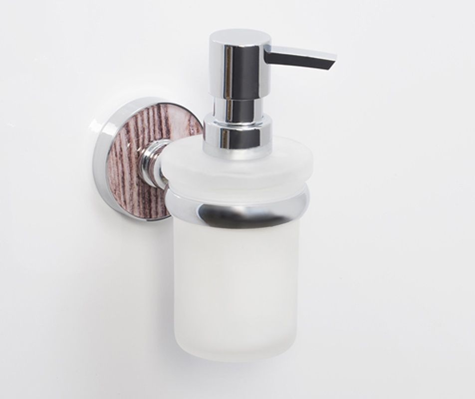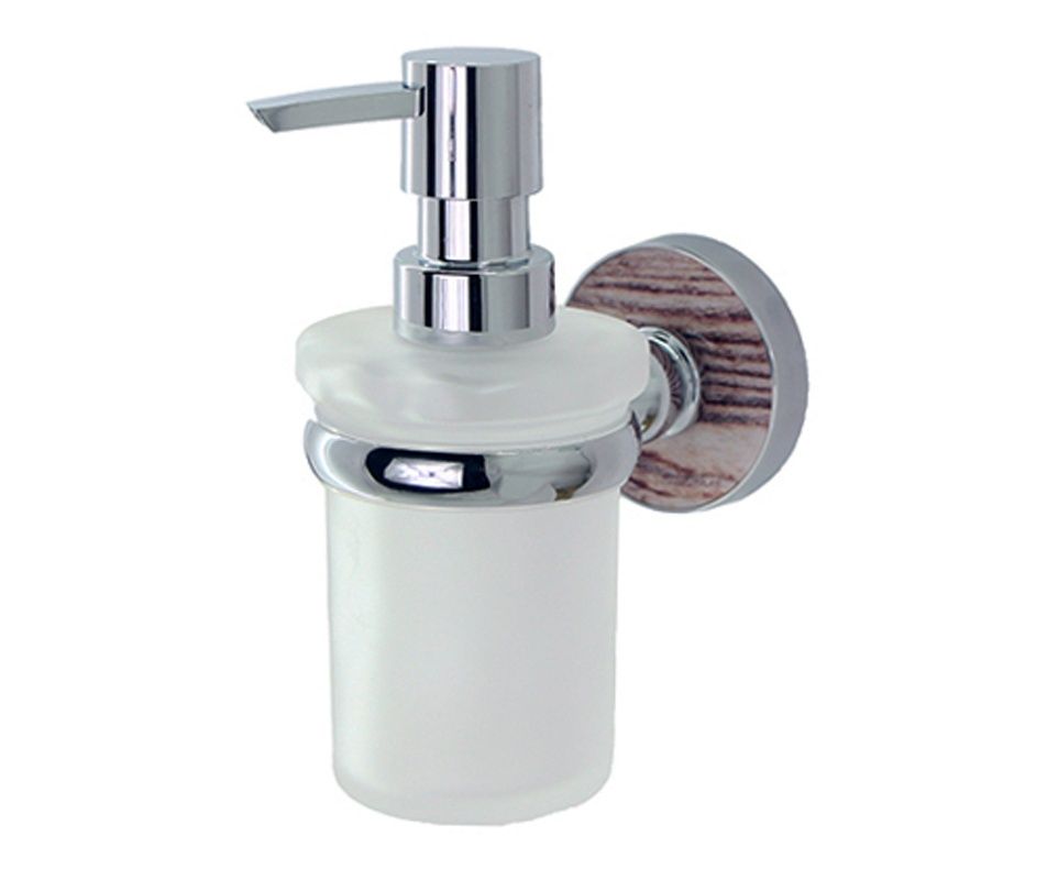 WasserKRAFT Дозатор для жидкого мыла с держателем K-6999Размер: Ш70 х Г111 х В148 ммМонтаж: настенныйОбъем: 170 млЦвет держателя: хром, акриловая вставка "обработанное дерево"Дозатор: матовое стеклоМатериалы: металл, акрил, хромоникелевое покрытие, уплотнительные пластиковые кольца, матовое стекло