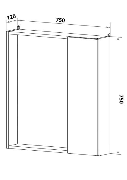 Зеркальный шкаф без подсветки и с открытой нижней полкой. Справа или слева (зависит от установки) шкафчик с распашным фасадом, за которым две внутренние полки. Петли со встроенным доводчиком. Универсальный.
