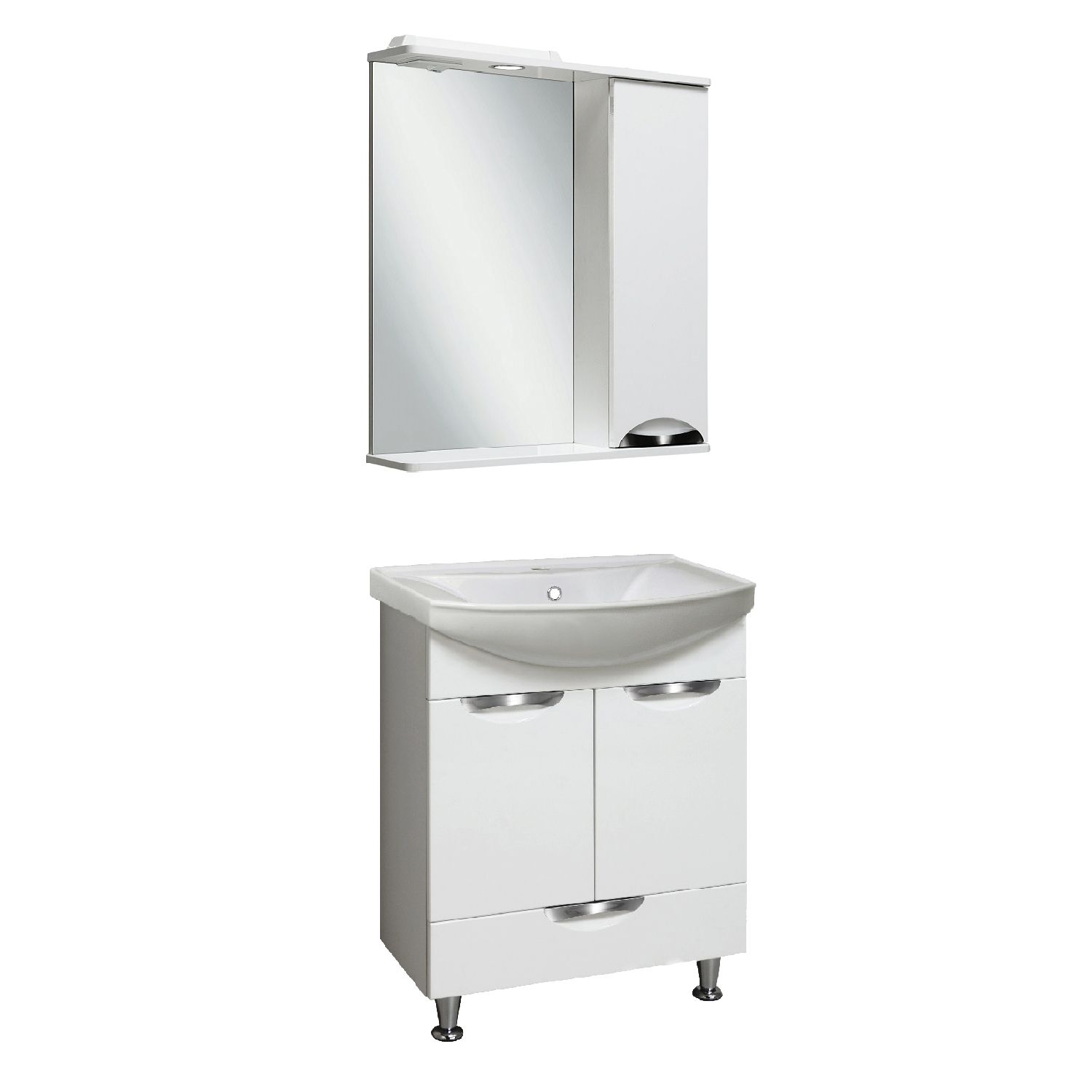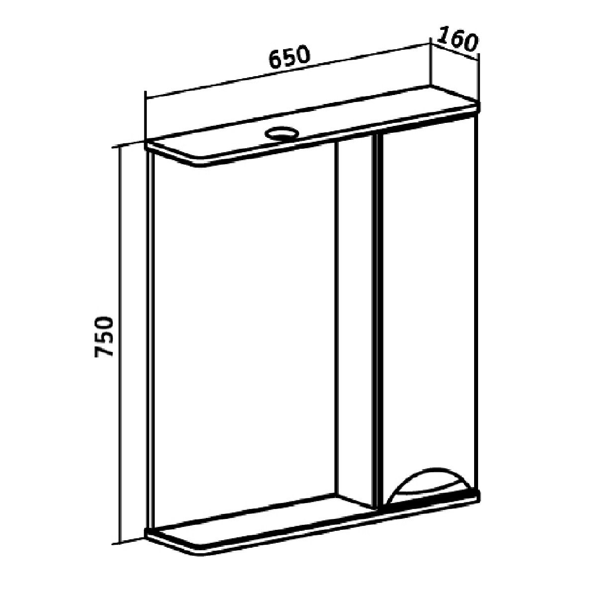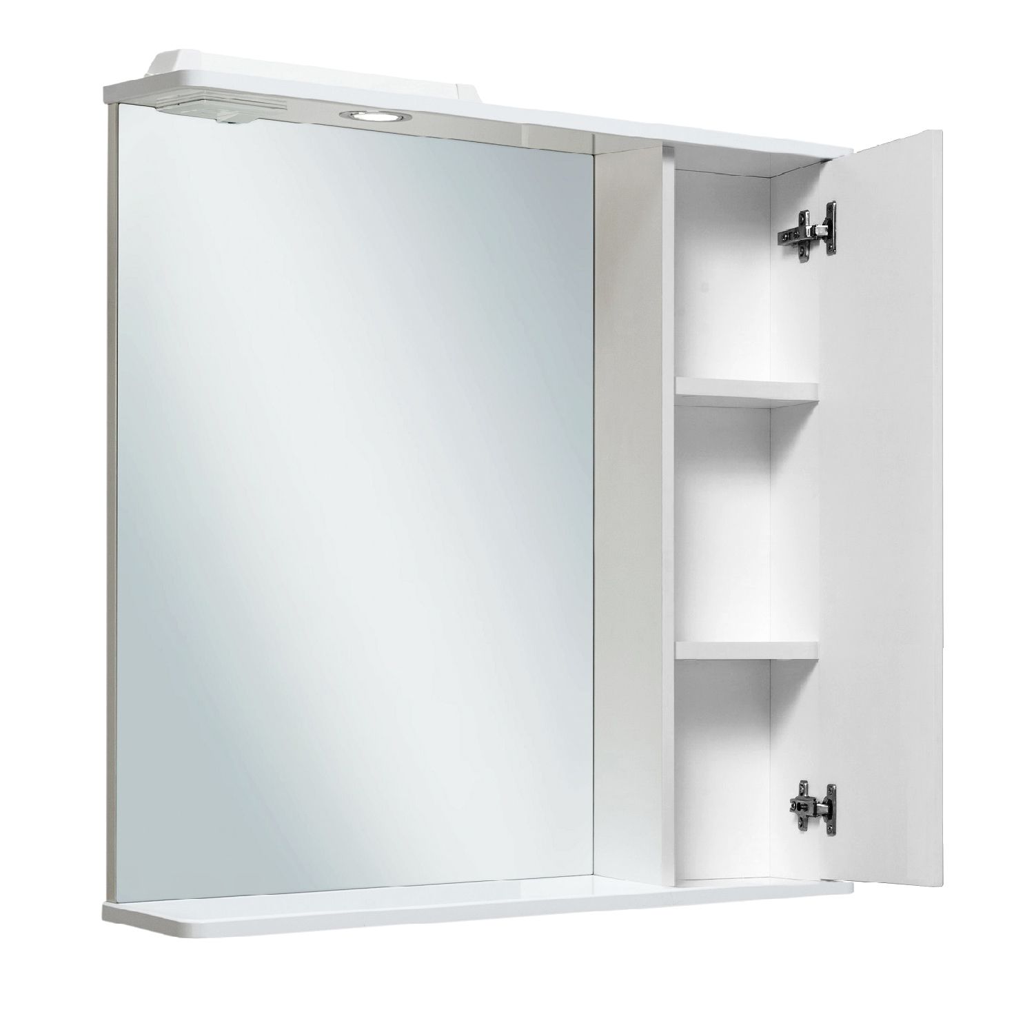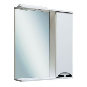 Зеркальный шкаф оборудован одним врезным светодиодным светильником 220В и розеткой с выключателем. Справа шкафчик с распашным фасадом, за которым две внутренние полки. Петли со встроенным доводчиком, ручка -1 шт. Выпускается только в правом исполнении.