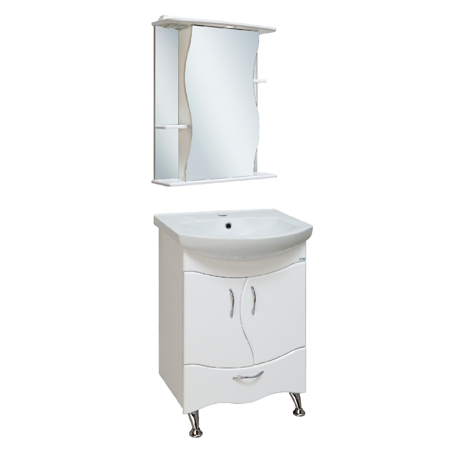 Зеркальный шкаф оборудован одним врезным светодиодным светильником 220В и розеткой с выключателем. По центру - шкаф с фигурной зеркальной дверцей и двумя внутренними полками, справа и слева - по одной открытой полке. Петли с доводчиком. Выпускается только в правом исполнении.