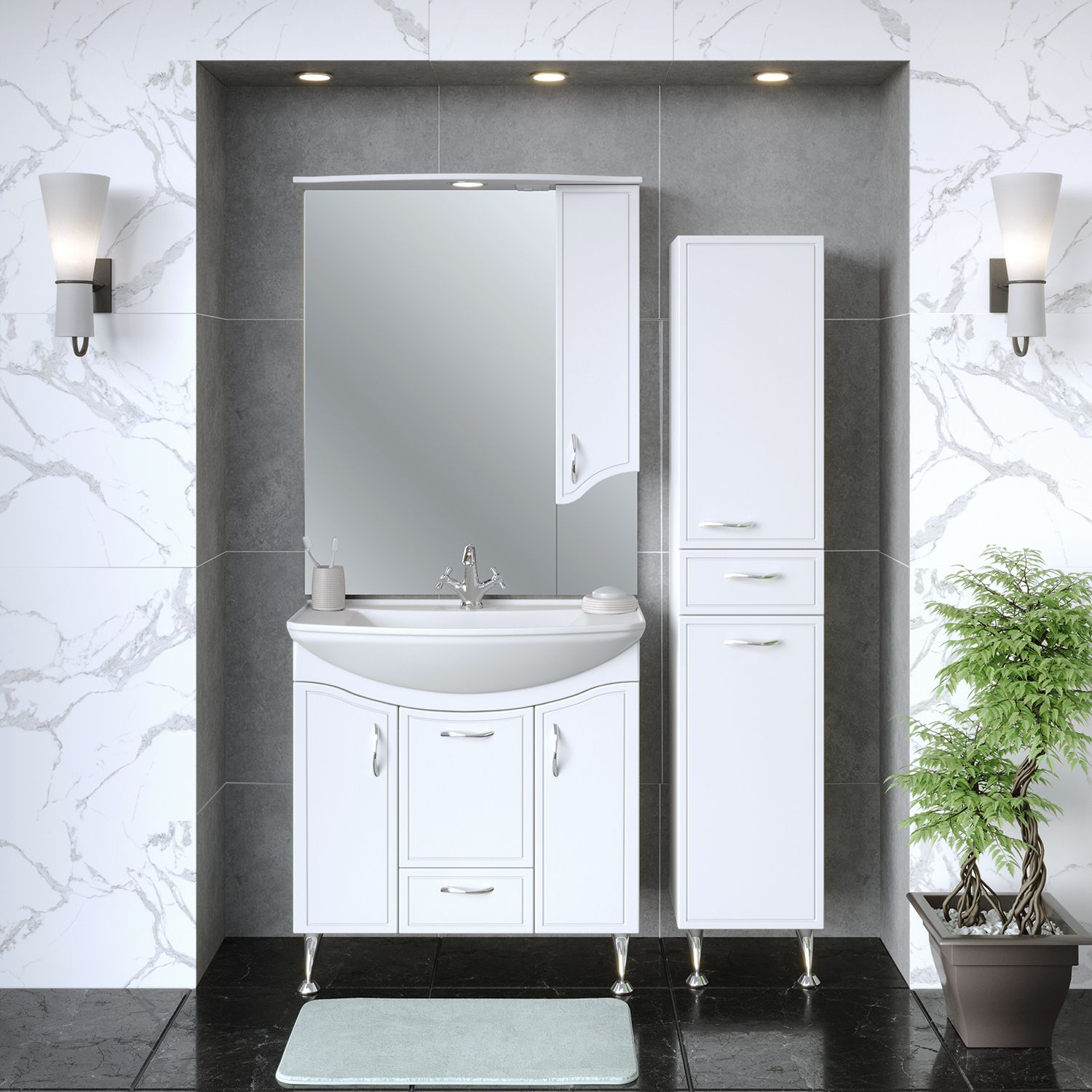 Зеркальный шкаф оборудован одним врезным светодиодным светильником 220В и розеткой с выключателем. Справа - шкафчик с распашным фасадом и двумя внутренними полками. Петли со встроенным доводчиком, ручка - 1шт. Выпускается только в правом исполнении.