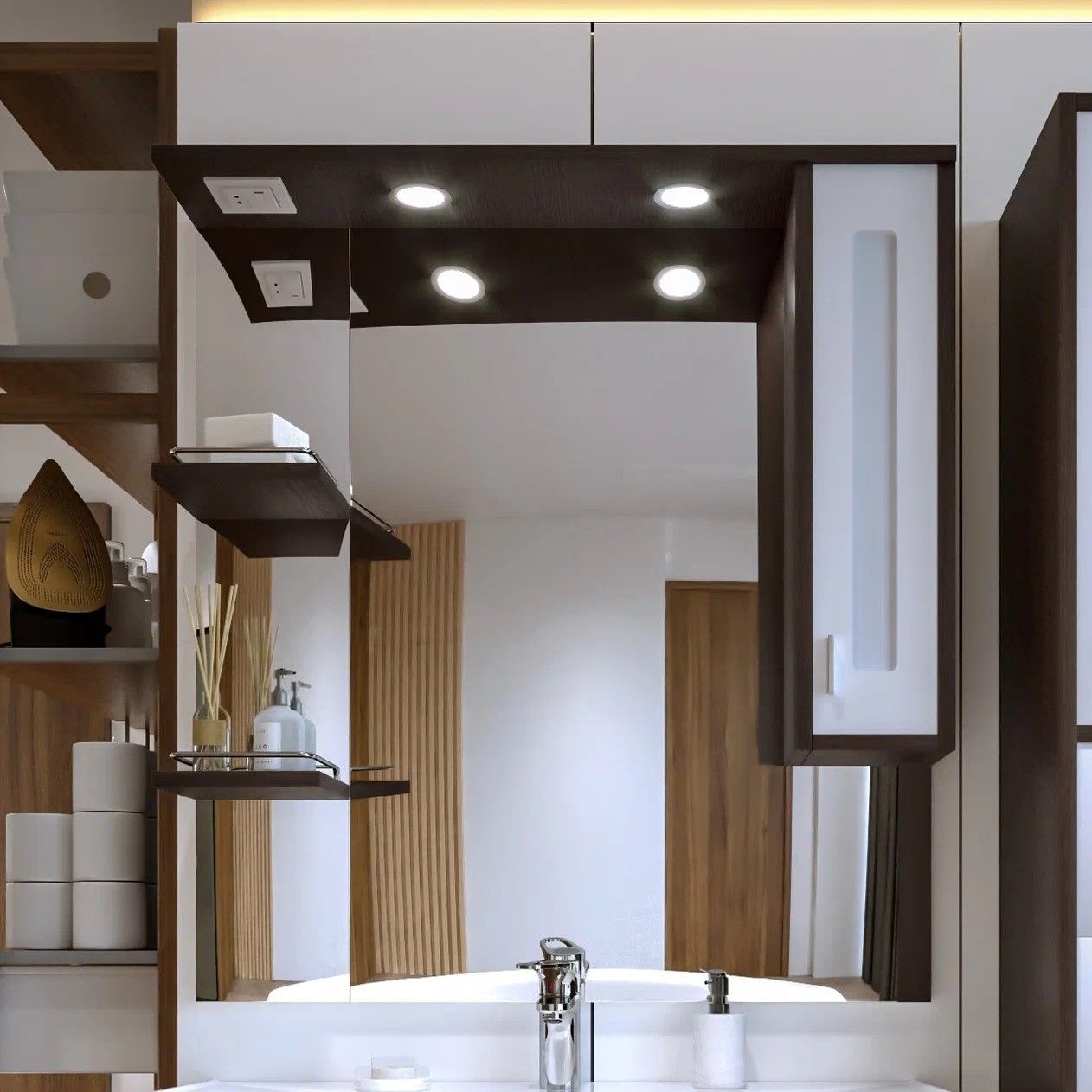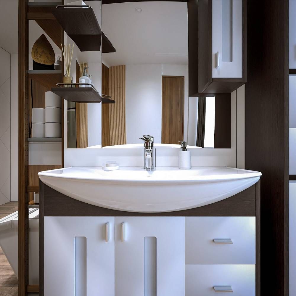 Внутреннее содержание шкафа умело организовано: разнообразные полки и отсеки позволяют удобно разместить все необходимые аксессуары – от косметики до бытовой химии. Зеркало, интегрированное в фасад, визуально расширяет пространство и облегчает утренние рутинные процедуры.