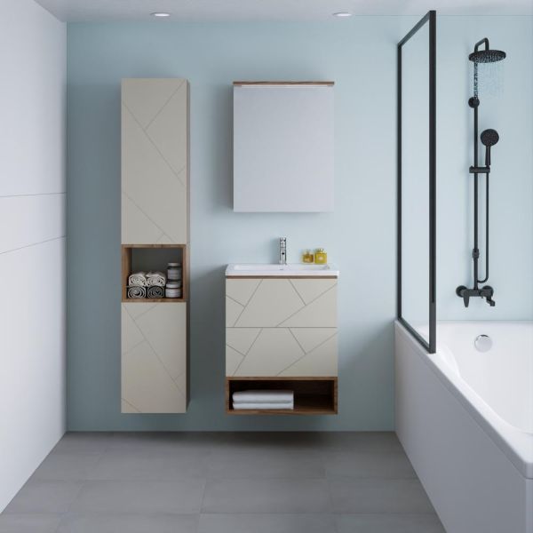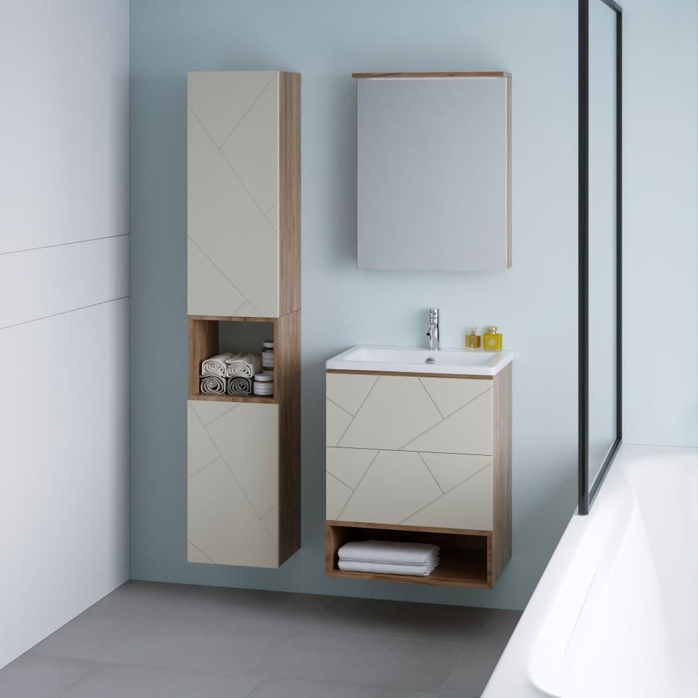 Внутреннее содержание шкафа умело организовано: разнообразные полки и отсеки позволяют удобно разместить все необходимые аксессуары – от косметики до бытовой химии. Зеркало, интегрированное в фасад, визуально расширяет пространство и облегчает утренние рутинные процедуры.