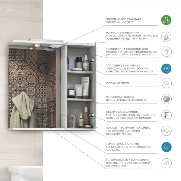 Оснащение: 1 дверца; 2 полки ЛДСП; ручка металлическая хромированная; 1 светодиодный светильник, включатель с розеткой