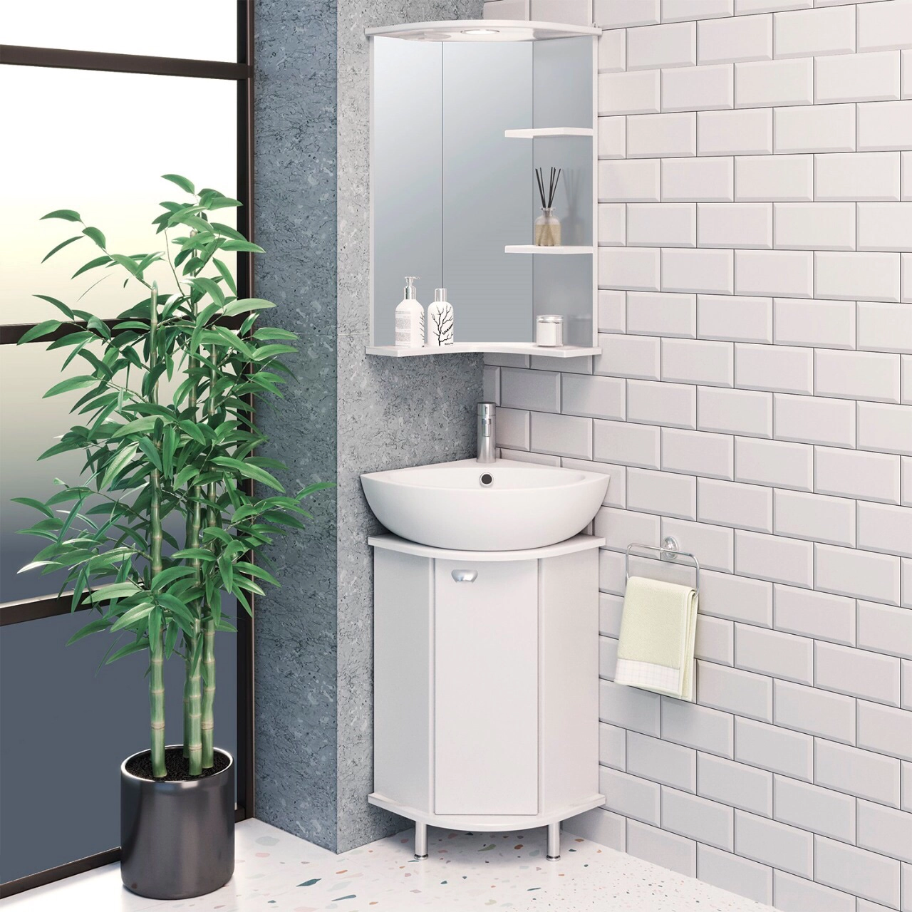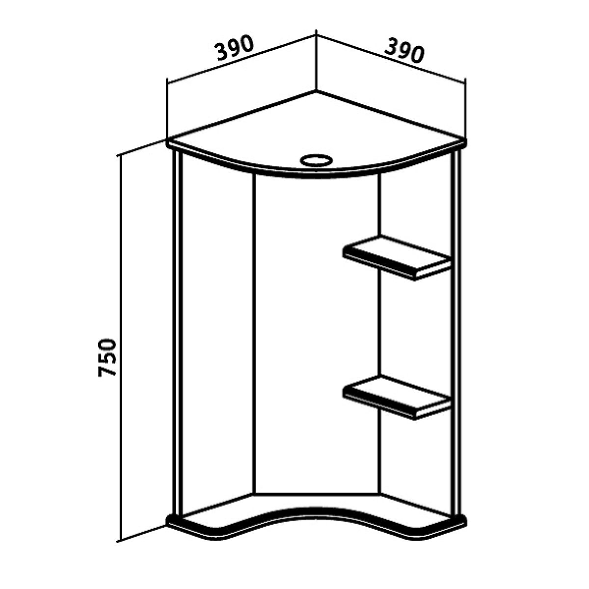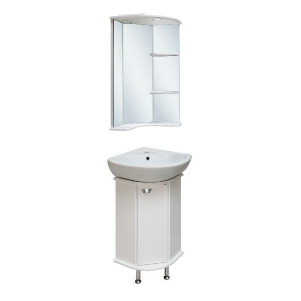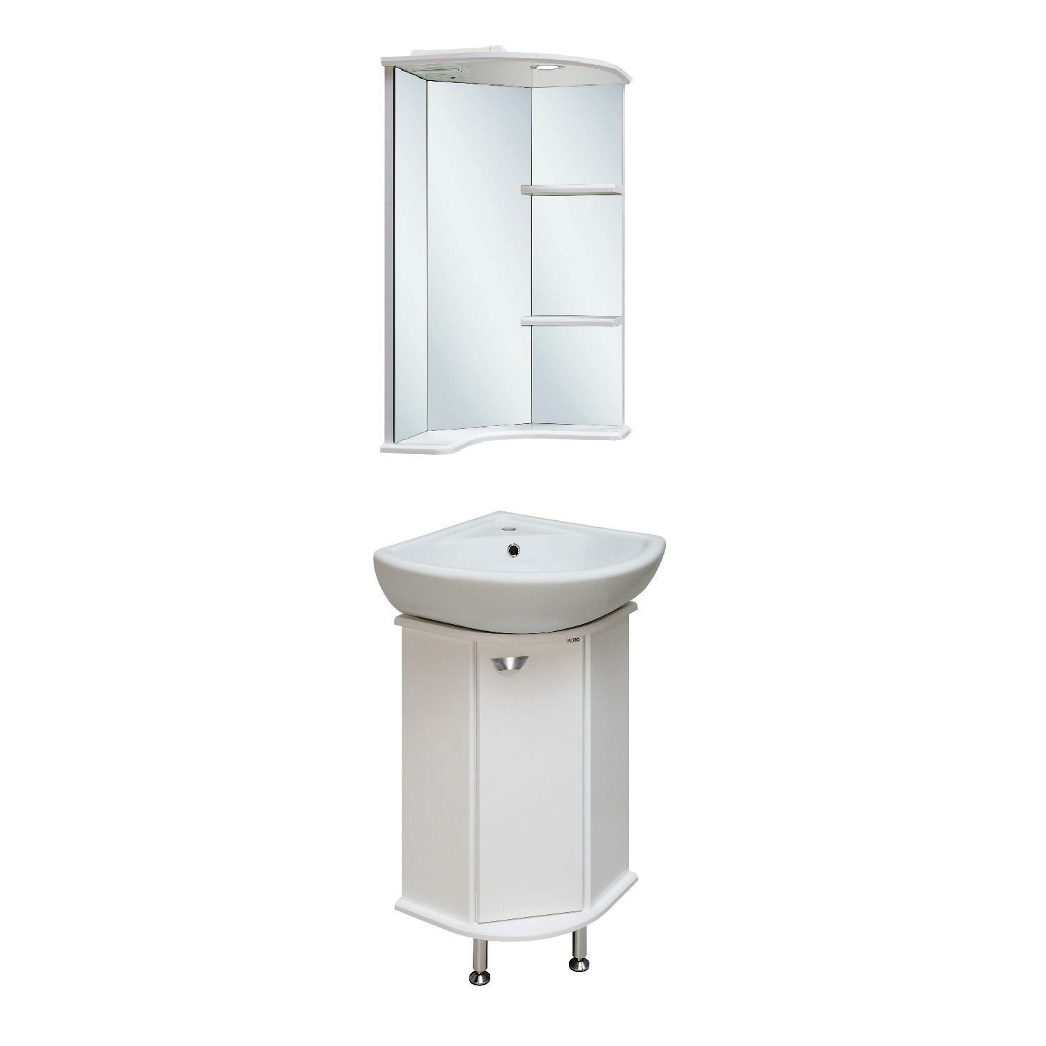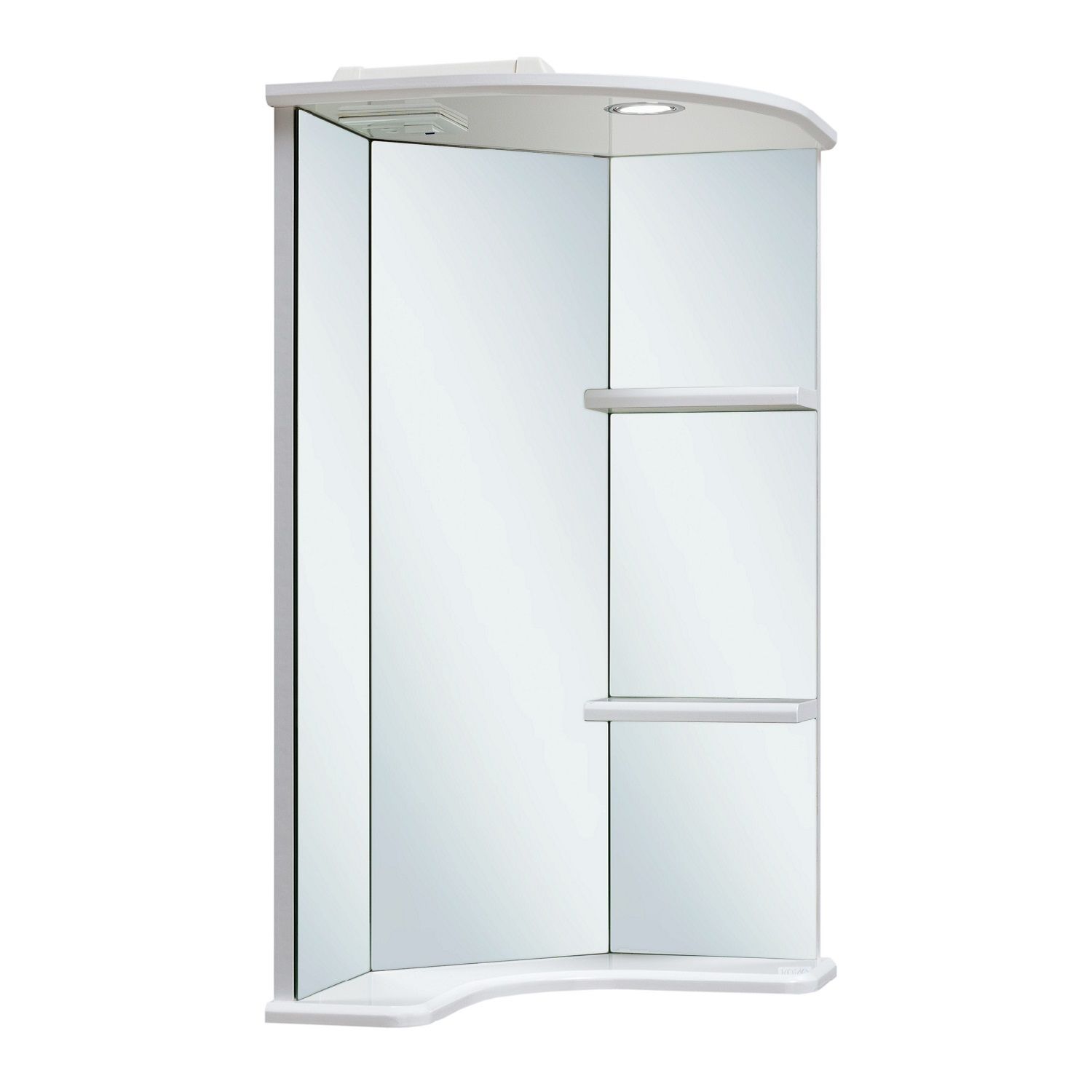 Угловое навесное зеркало с козырьком и нижней полкой. Оборудовано одним врезным светодиодным светильником 220В, розеткой с выключателем. Справа две открытые полочки.
