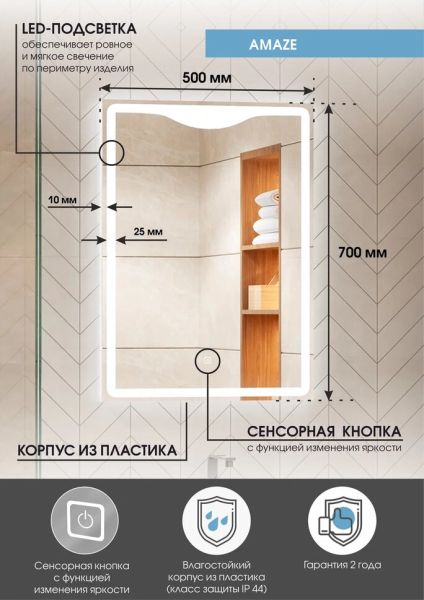 Зеркало "Amaze Led" 500х700LED подсветка 6000Ксенсорный выключатель с функцией димирования