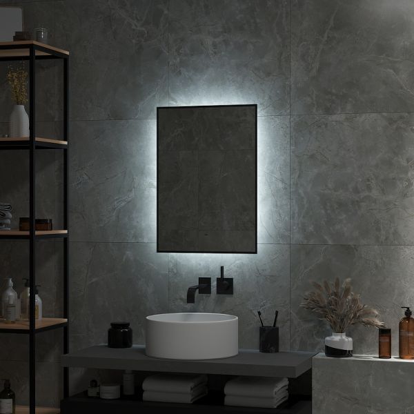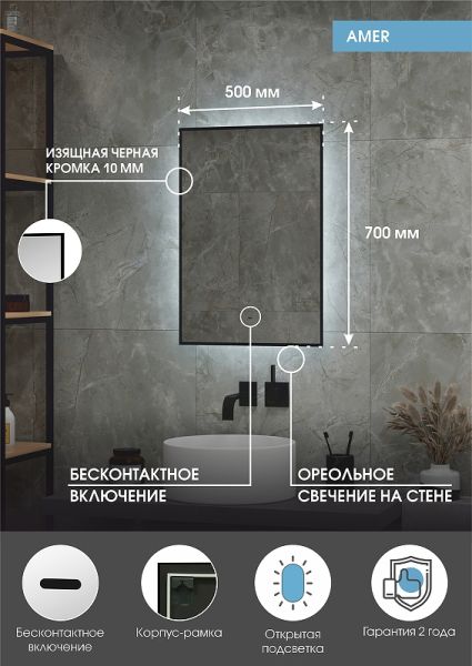 Зеркало "Amer Led" с фоновой подсветкой, бесконтактным сенсором, черной окантовкой 500х700LED подсветка 6000К; бесконтактный сенсор с функцией димирования;открытая ореольная подсветка.