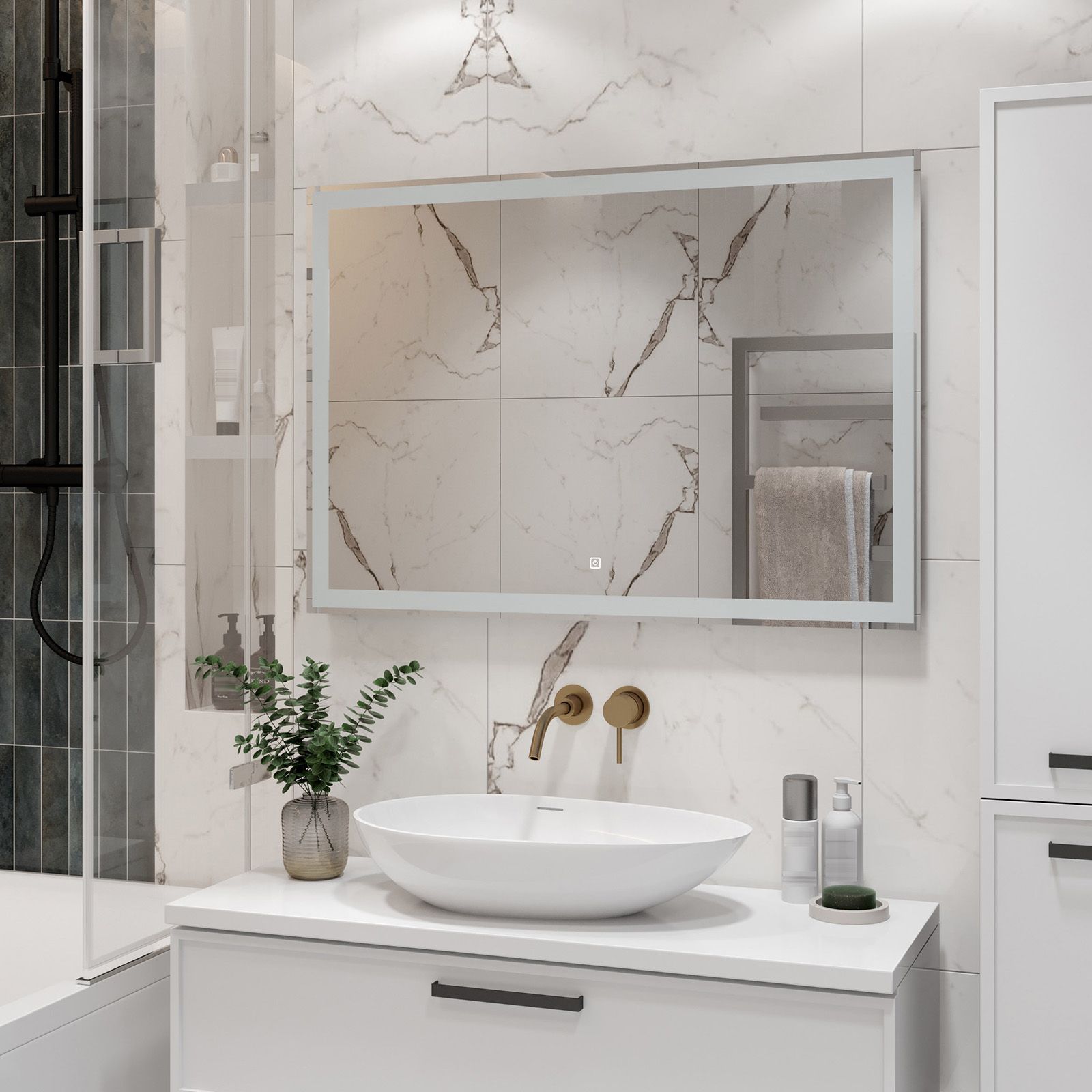 Зеркало с подсветкой для ванной комнаты — это элемент интерьера, который сочетает в себе функции, эстетику и современный дизайн. Его изящная форма и тонкие линии легко вливаются в любое пространство, создавая атмосферу утонченности и уюта.Интегрированная светодиодная подсветка обрамляет зеркало, даря мягкий, рассеянный свет, который не только позволяет удобно наносить макияж, но и наполняет ванную комнату теплом и позитивной энергией.Классический дизайн позволяет использовать его в различных стилях – от минимализма до современного эклектичного оформления. Оно прекрасно вписывается в любую цветовую гамму, будь то нейтральные тона или более яркие акценты.