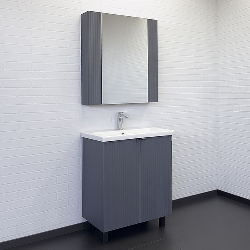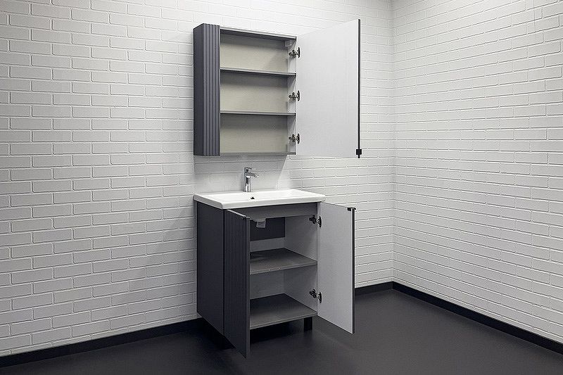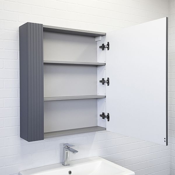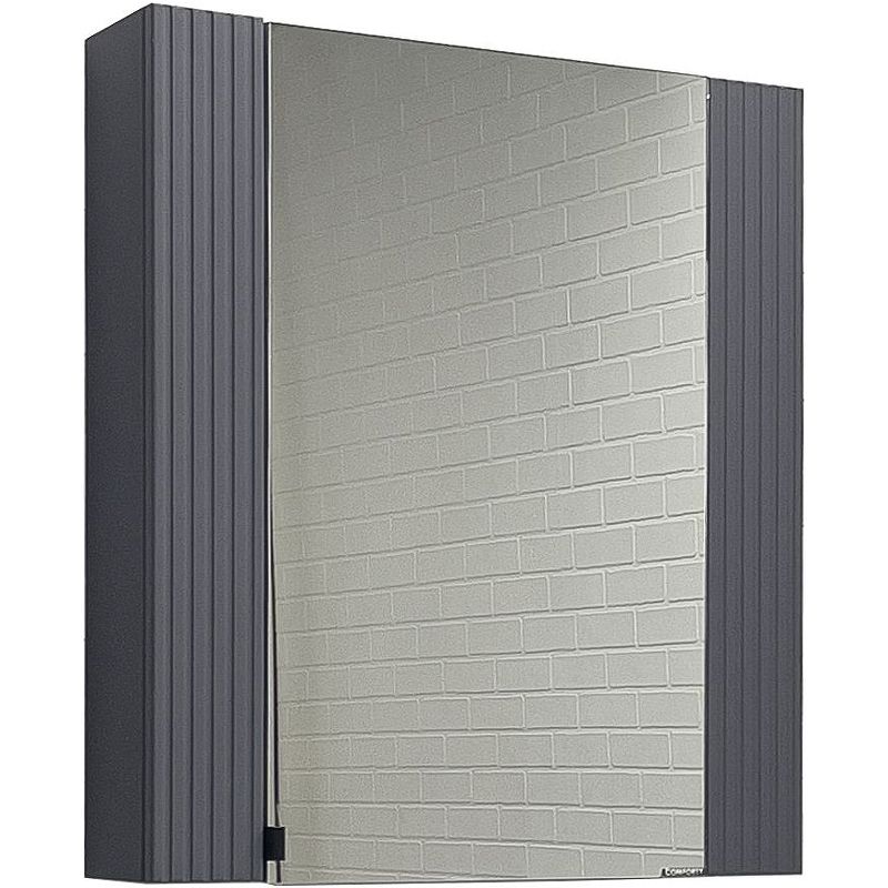 Зеркало-шкаф Comforty Лима 00-00004891 70 см АнтрацитВысококачественное полотно с амальгамой на основе серебра. Створка декорирована вертикальной фрезеровкой и оснащена петлями плавного закрывания. За створкой две полки. В модели применяется плёнка с эффектом Soft-Touch.