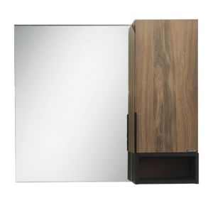 Створка оснащена системой плавного закрывания и черной матовой алюминиевой ручкой. Высококачественное зеркальное полотно с амальгамой на основе серебра. Фасад и корпус из влагостойкого ЛДСП дуб темно-коричневый. За створкой одна горизонтальная полка. Название: Зеркало-шкаф