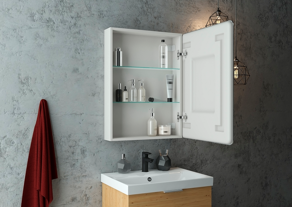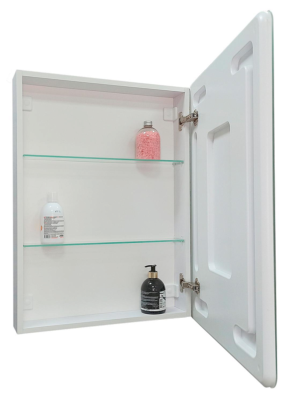 Зеркало-шкаф "Emotion LED" 600х800LED подсветка 6000К; сенсорное включение справа по центру, реверсивные крепления, пластиковый короб, прямые углы на коробе и радиусные на зеркале, полка/2 шт, без розетки, петли Firmax