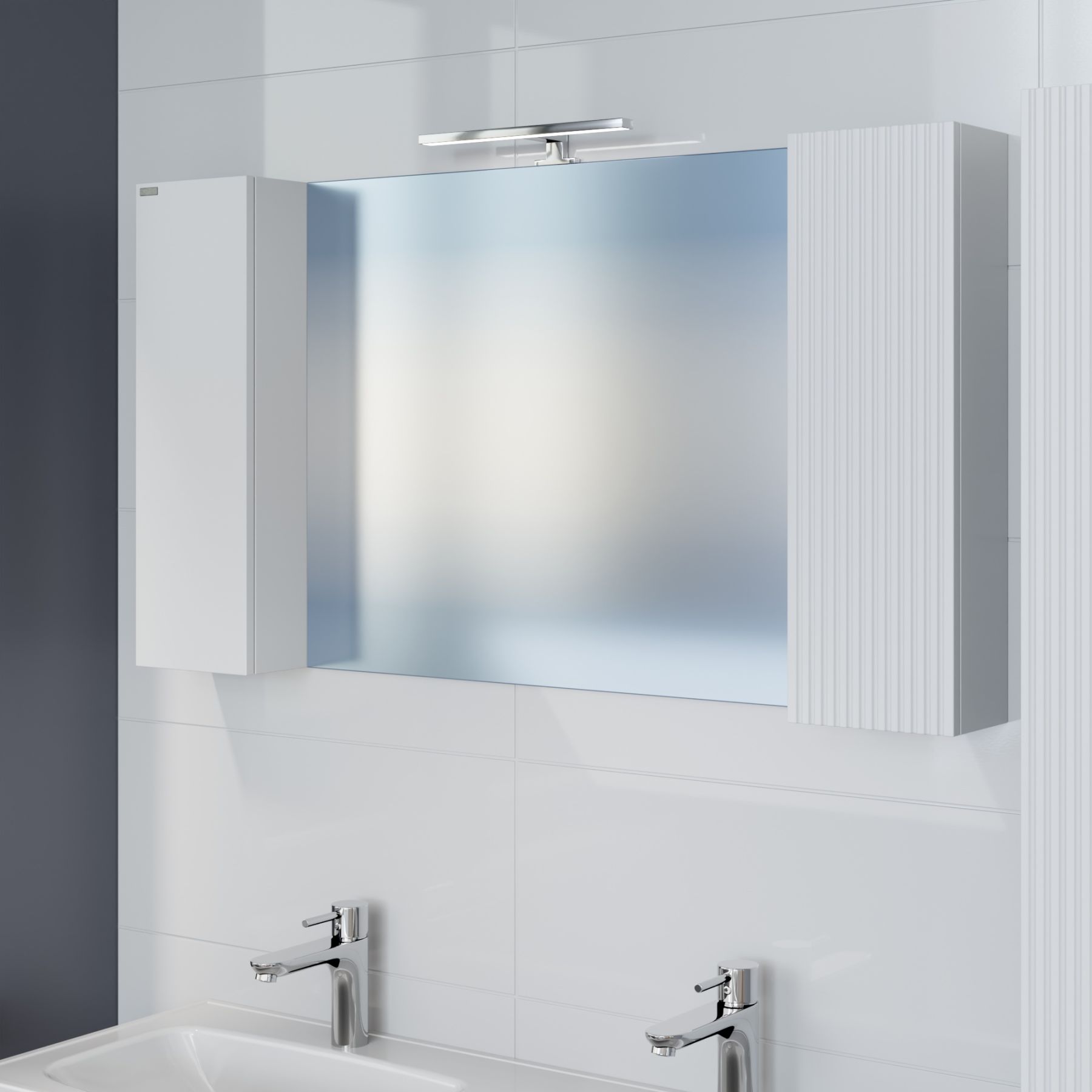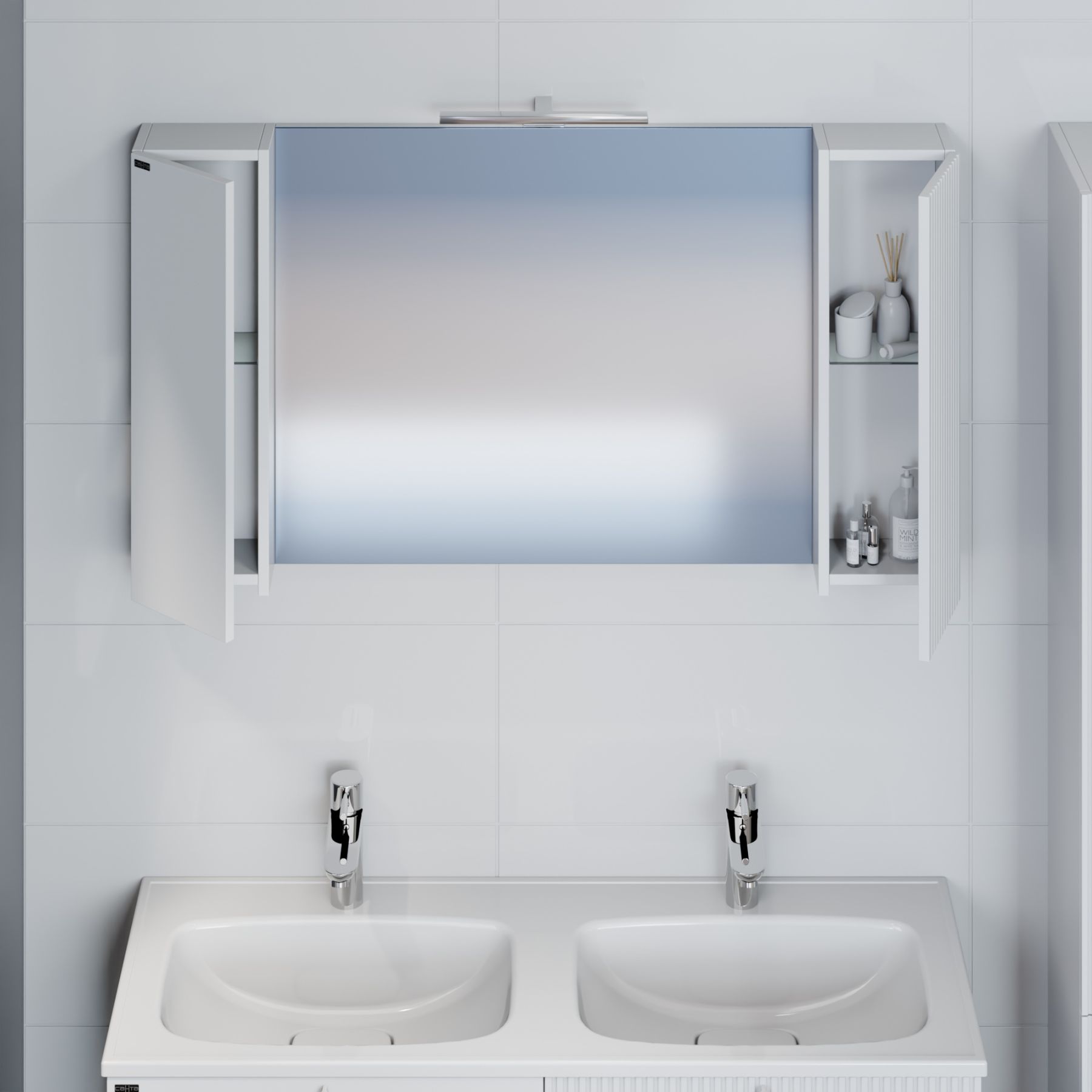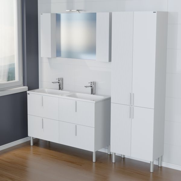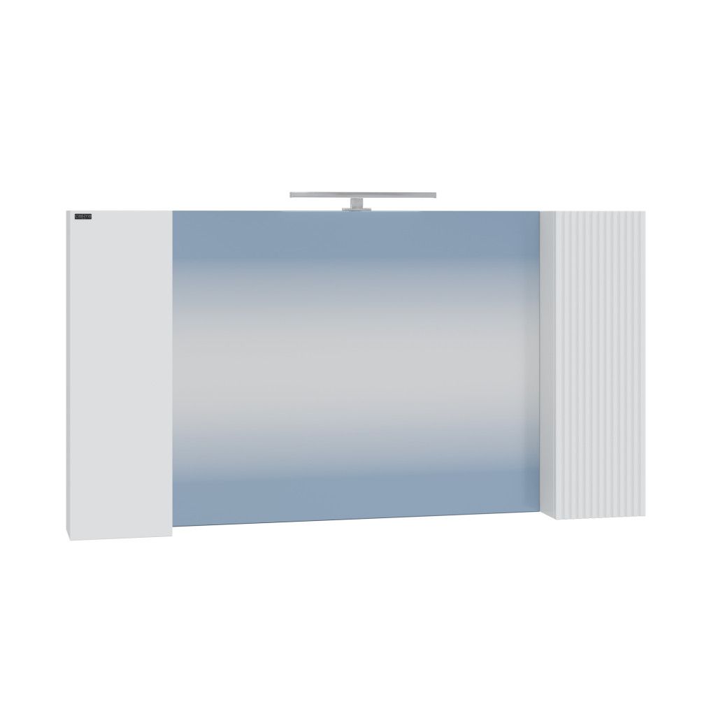 Коллекция мебели для ванной комнаты Санта Вега — это современное решение для вашей ванной комнаты. Фасады и боковины выполнены из МДФ и покрыты глянцевой эмалью. Дверцы оснащены петлями плавного закрывания. Один фасад зеркального шкафа выполнен с вертикальной реечной фрезеровкой, второй покрыт белой глянцевой эмалью. В комплектацию входит светильник, который можно подключить к внешней проводке ванной комнаты, выключатель в комплектацию не входит.